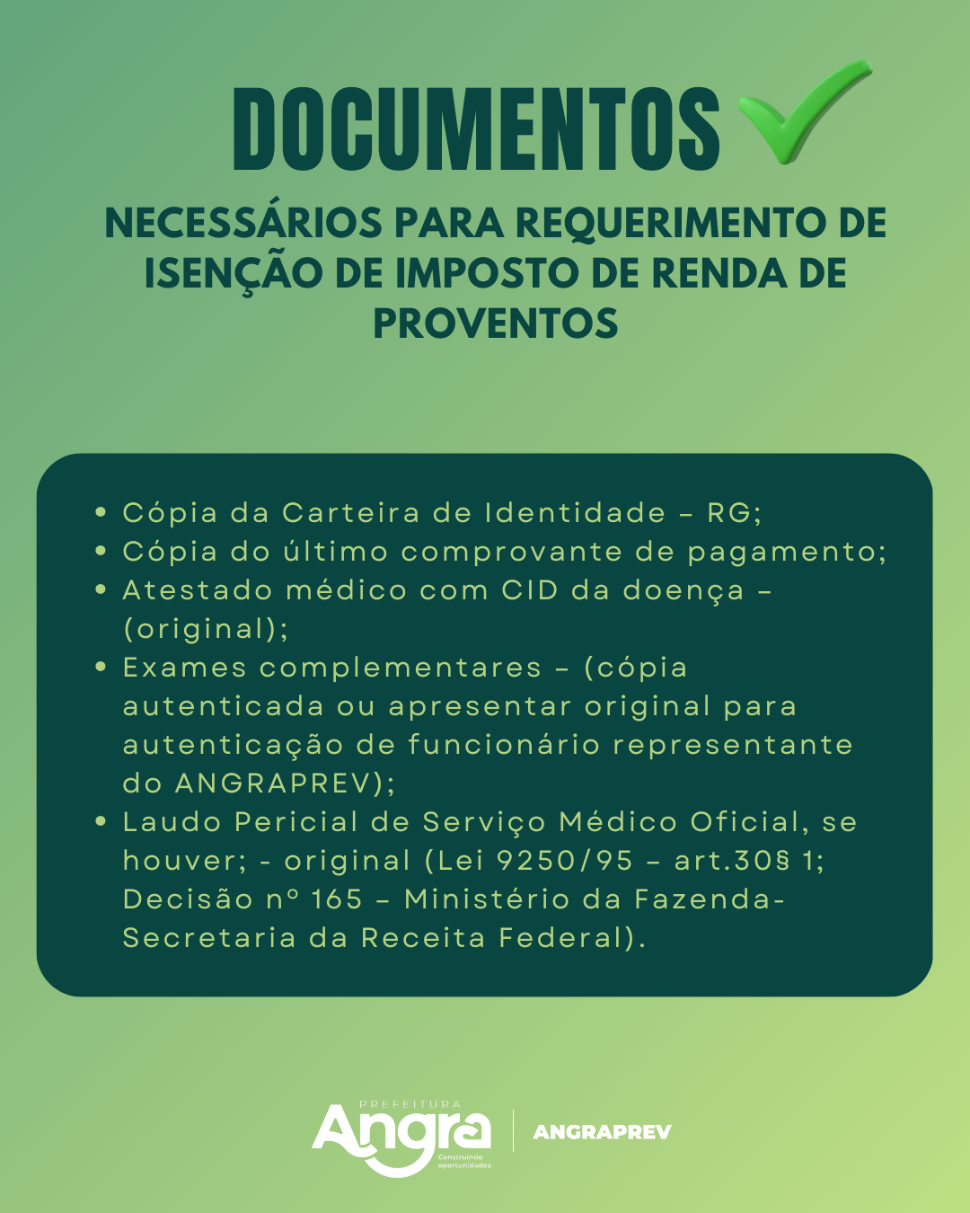 Formulário de Isenção de Imposto de Renda Cópia da Carteira de Identidade - RG; Cópia do último comprovante de pagamento; Atestado médico com CID da doença - (original); Exames complementares - (cópia autenticada ou apresentar original para autenticação de funcionário representante do ANGRAPREV); Laudo Pericial de Serviço Médico Oficial, se houver; - original (Lei 9250/95 - art.30§ 1; Decisão nº165 - Ministério da Fazenda- Secretaria da Receita Federal)